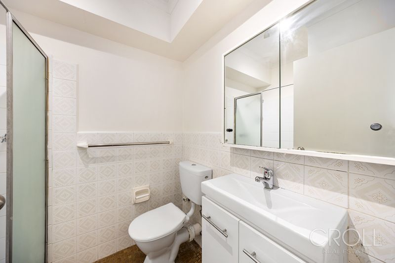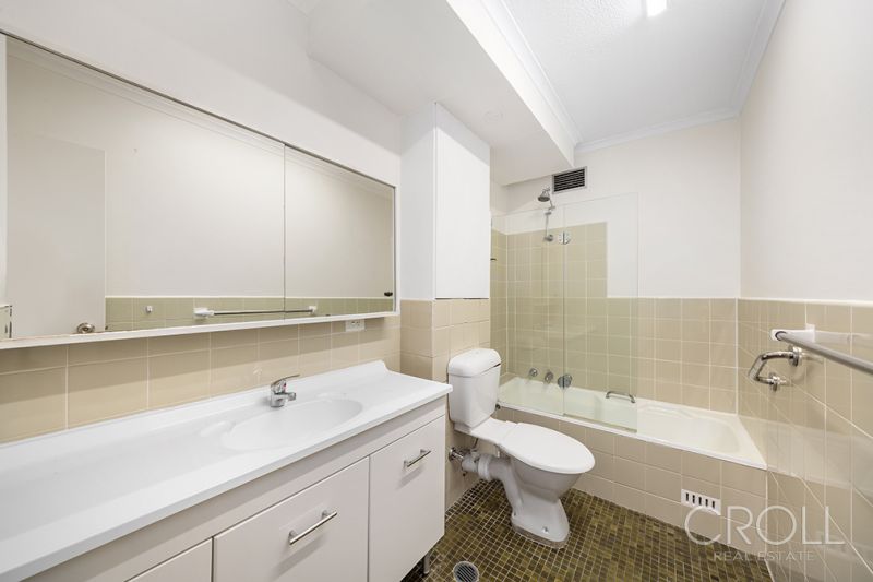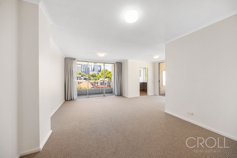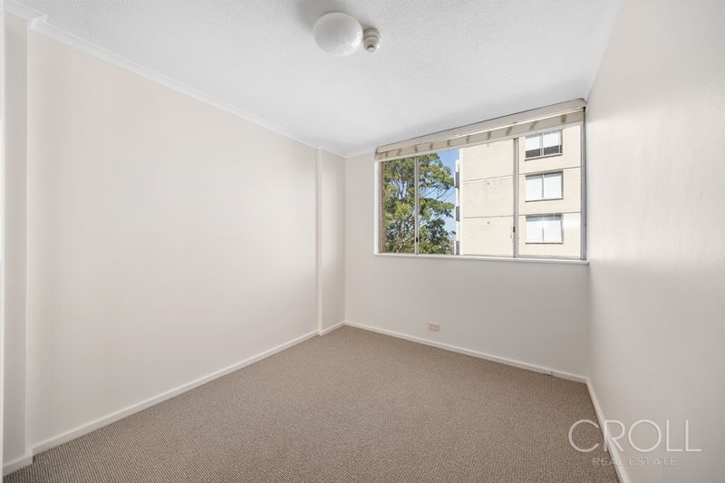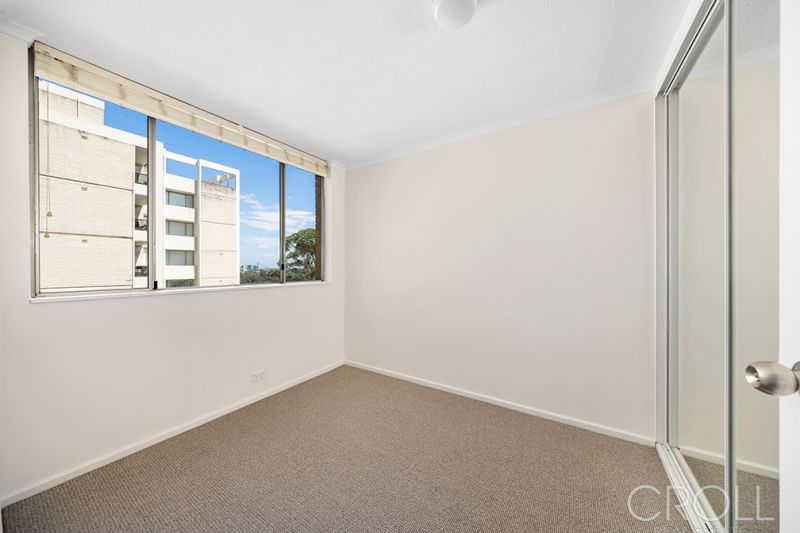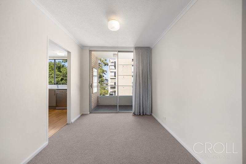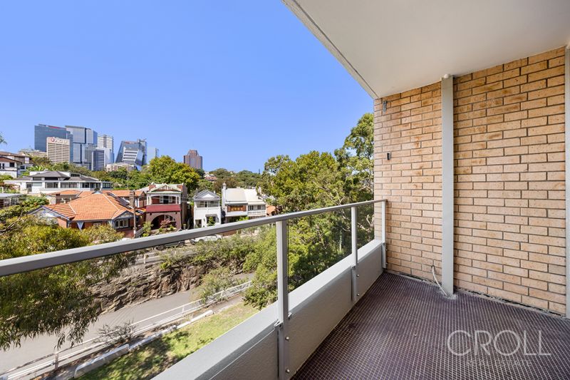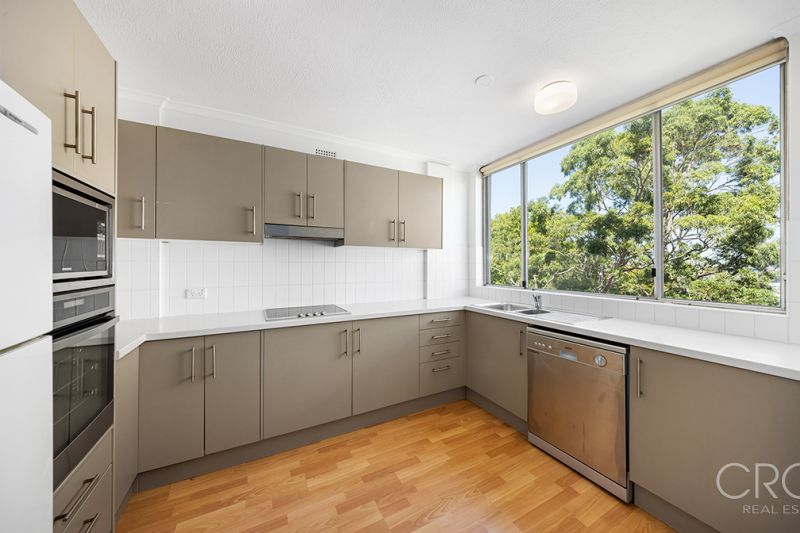 The apartment includes a renovated kitchen with stainless steel appliances, including a microwave and refrigerator, and flows into the open-plan lounge and dining area. Two balconies extend from the living space, capturing beautiful views over Balls Head Bay and Berry Bay, with a south-easterly aspect towards the city.