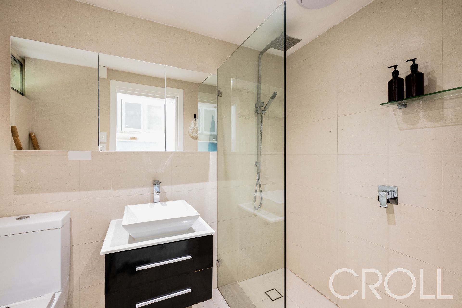– Bathroom with rainwater shower and frameless glass